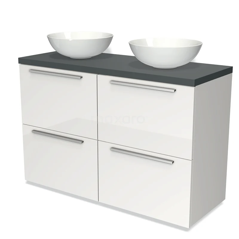 Modulo Plato Badmöbel mit Aufsatzwaschbecken | 120 cm Hochglanz Weiß Flach front Dunkelgrau blatt 4 hohe Schubladen