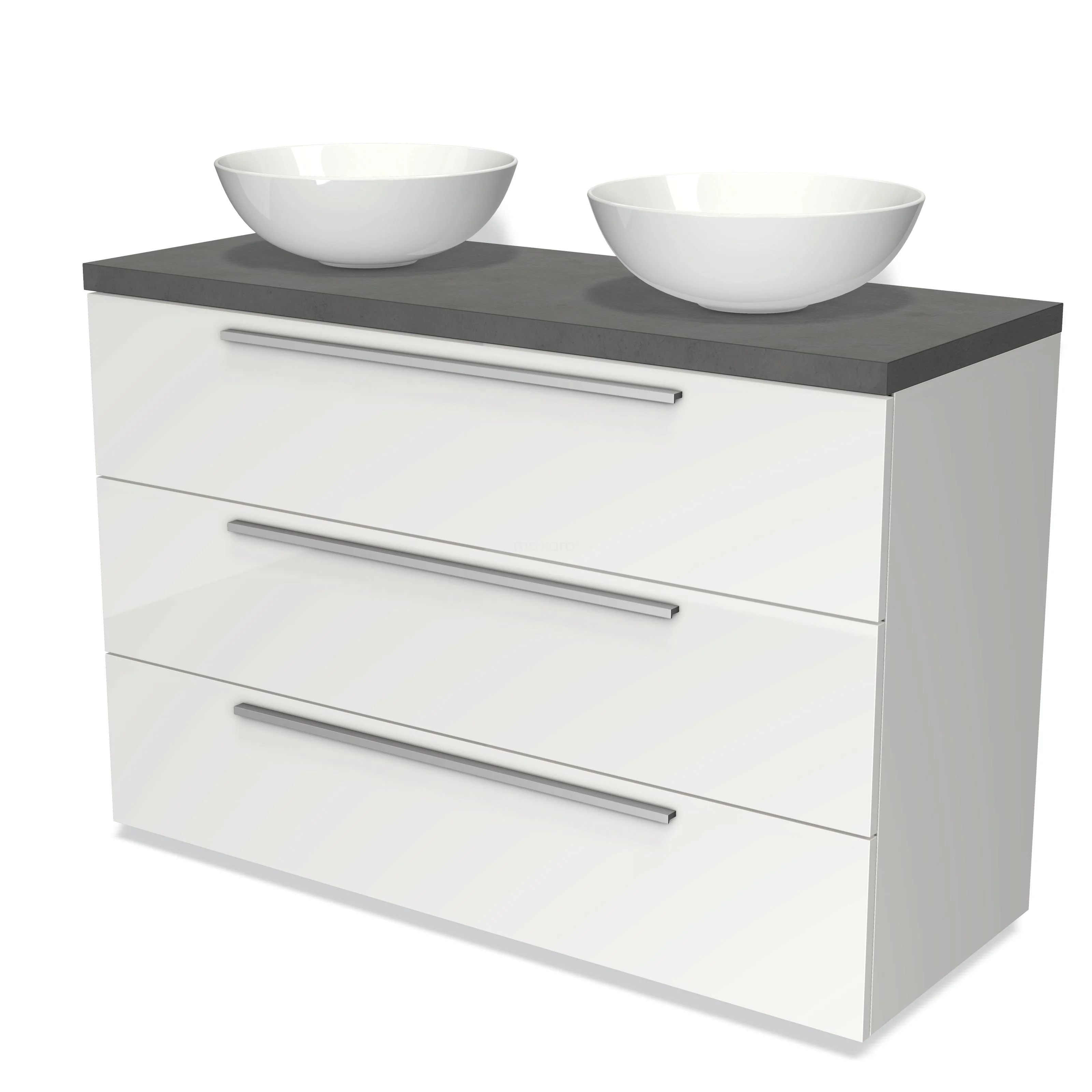 Modulo Plato Badmöbel mit Aufsatzwaschbecken | 120 cm Hochglanz Weiß Flach front Dunkelgrauer Beton blatt 3 Schubladen