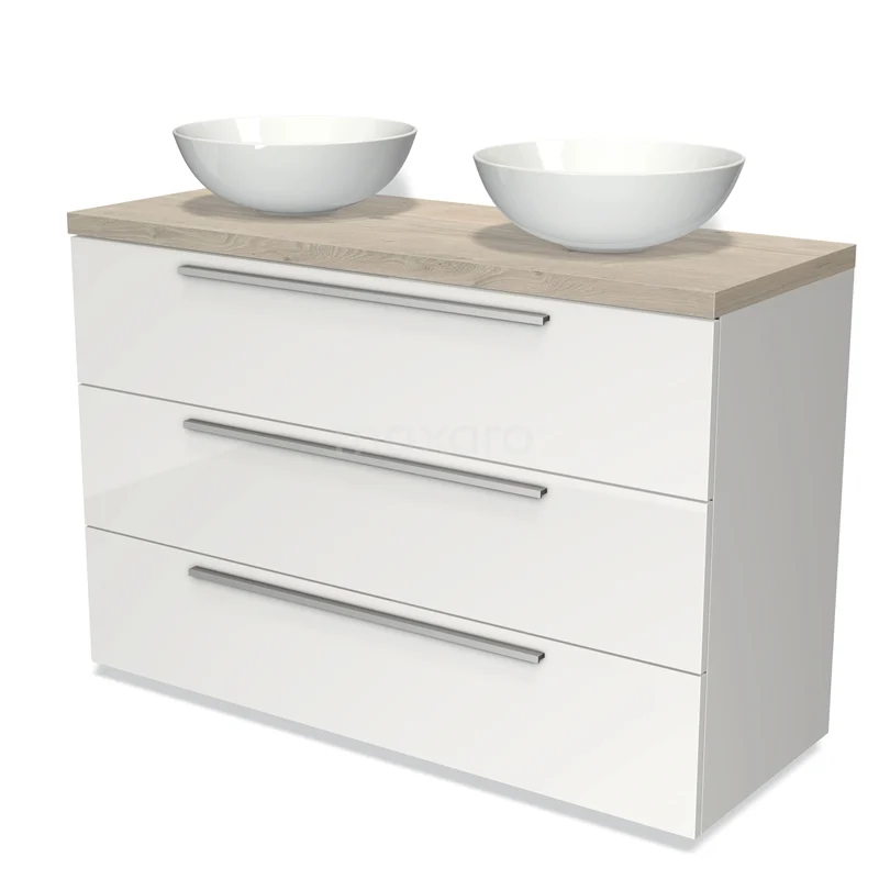 Modulo Plato Badmöbel mit Aufsatzwaschbecken | 120 cm Hochglanz Weiß Flach front Hellgraue Eiche blatt 3 Schubladen