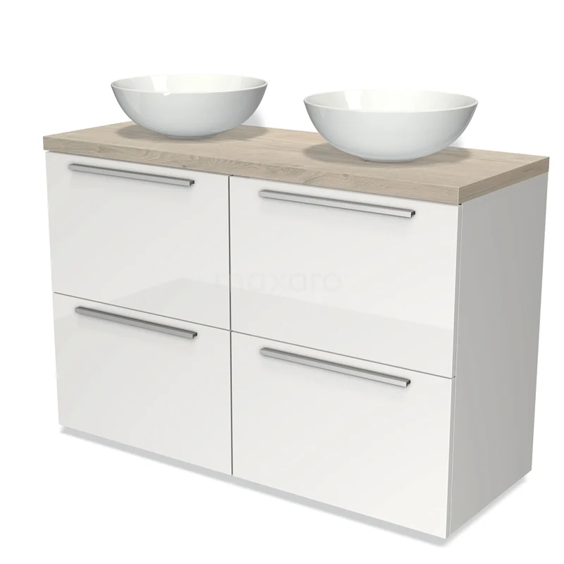 Modulo Plato Badmöbel mit Aufsatzwaschbecken | 120 cm Hochglanz Weiß Flach front Hellgraue Eiche blatt 4 hohe Schubladen