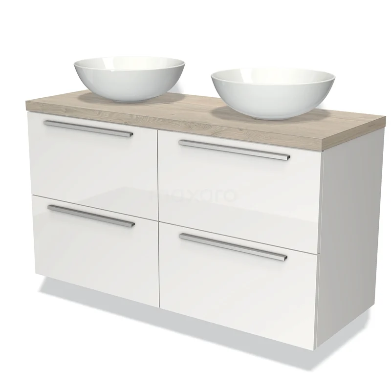 Modulo Plato Badmöbel mit Aufsatzwaschbecken | 120 cm Hochglanz Weiß Flach front Hellgraue Eiche blatt 4 Schubladen