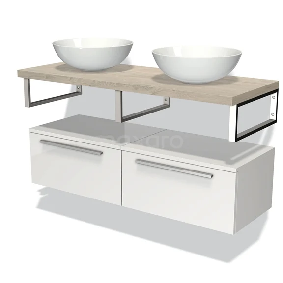 Modulo Plato Badmöbel mit Aufsatzwaschbecken | 120 cm Hochglanz Weiß Flach front Hellgraue Eiche blatt Tief hängend