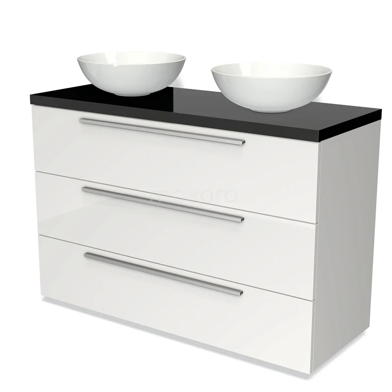 Modulo Plato Badmöbel mit Aufsatzwaschbecken | 120 cm Hochglanz Weiß Flach front Hochglanz Schwarz blatt 3 Schubladen