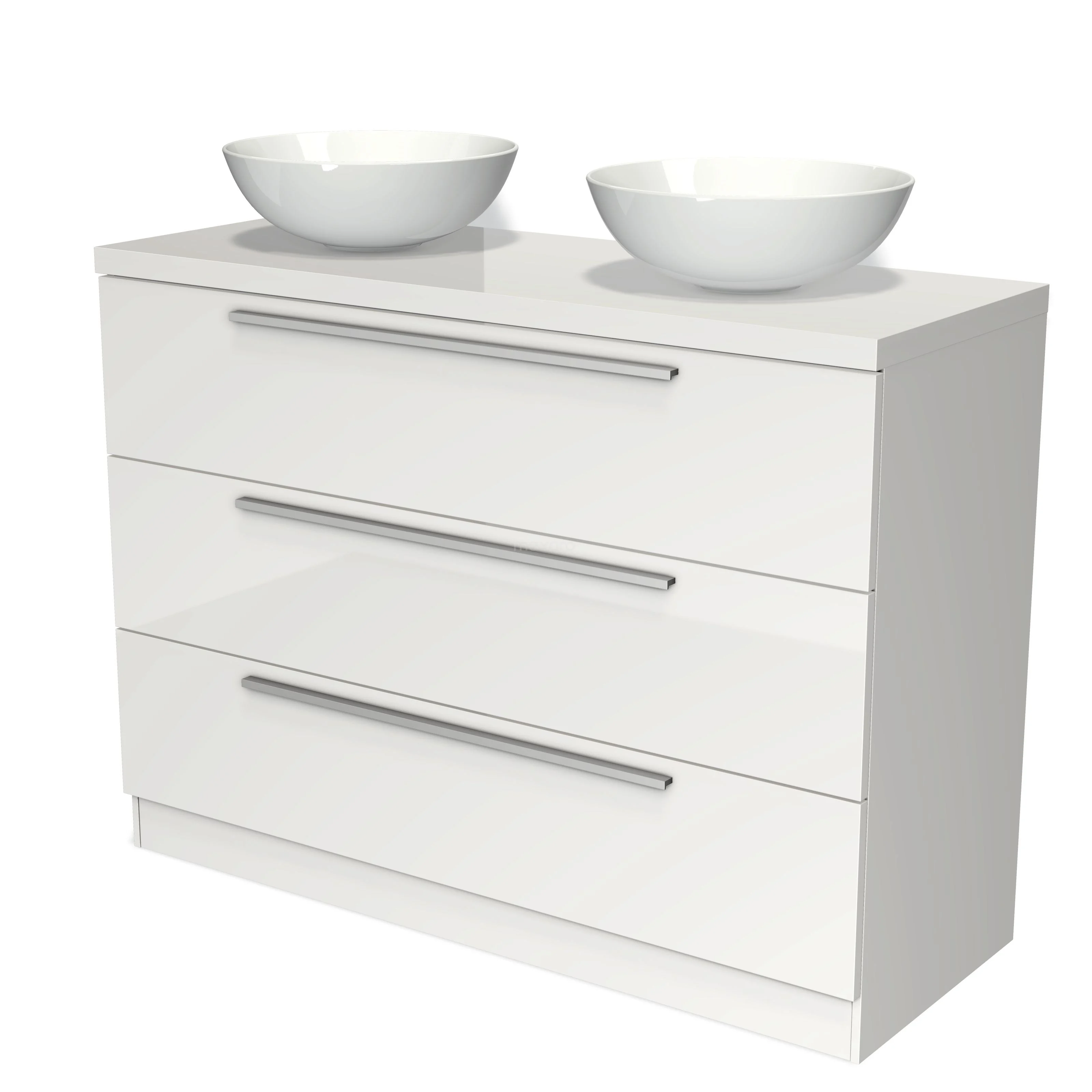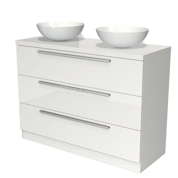 Modulo Plato Badmöbel mit Aufsatzwaschbecken | 120 cm Hochglanz Weiß Flach front Hochglanz Weiß blatt 3 stehende Schubladen