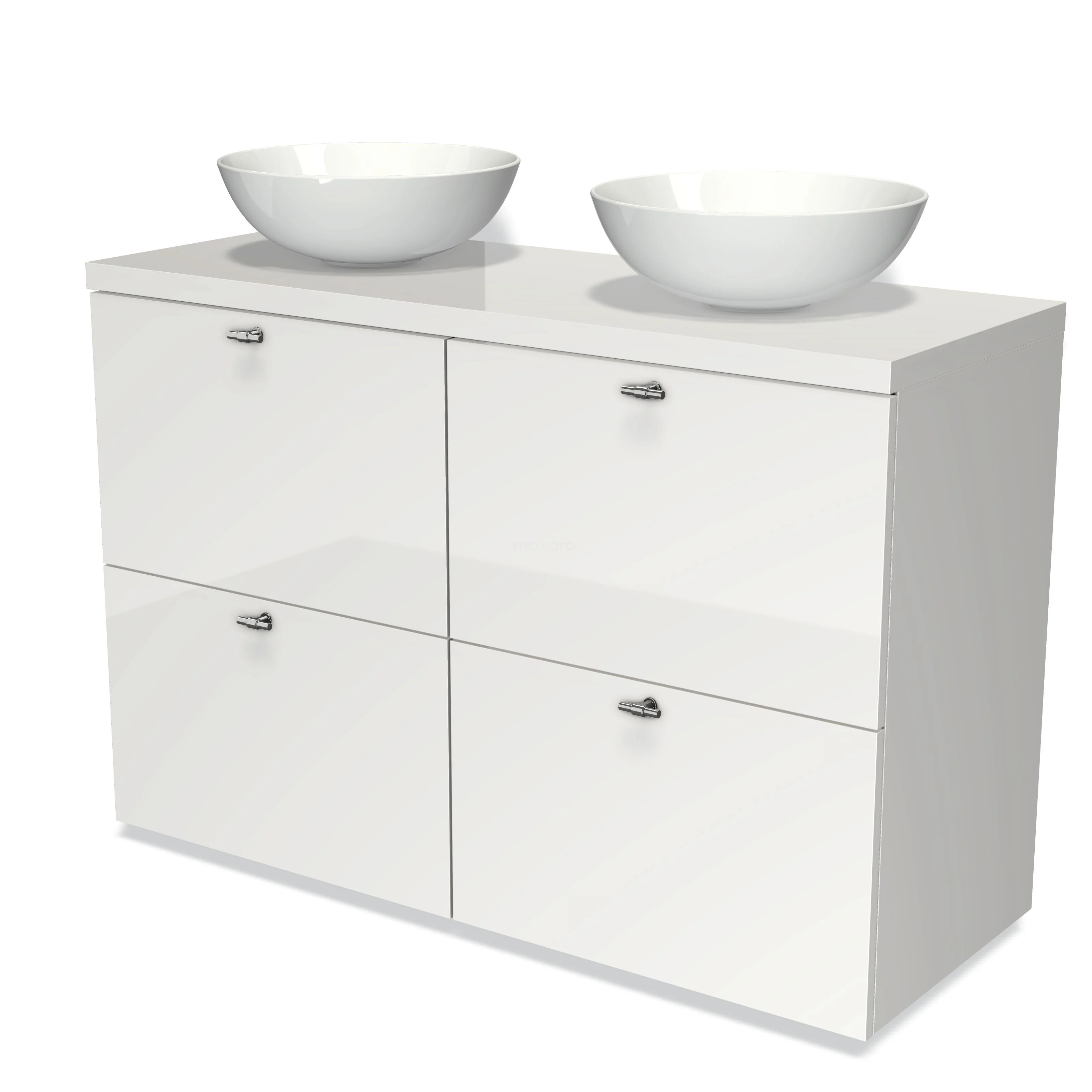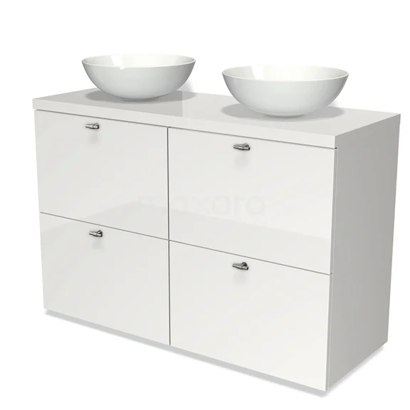 Modulo Plato Badmöbel mit Aufsatzwaschbecken | 120 cm Hochglanz Weiß Flach front Hochglanz Weiß blatt 4 hohe Schubladen
