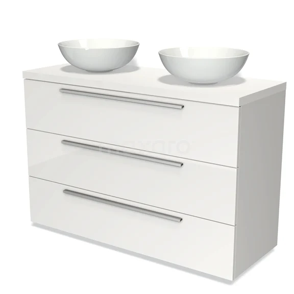 Modulo Plato Badmöbel mit Aufsatzwaschbecken | 120 cm Hochglanz Weiß Flach front Matt Weiß blatt 3 Schubladen