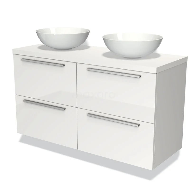 Modulo Plato Badmöbel mit Aufsatzwaschbecken | 120 cm Hochglanz Weiß Flach front Matt Weiß blatt 4 Schubladen