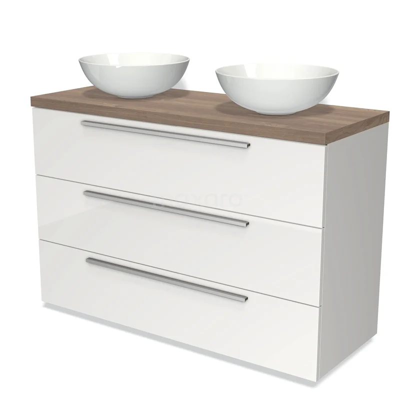 Modulo Plato Badmöbel mit Aufsatzwaschbecken | 120 cm Hochglanz Weiß Flach front Mittelbraune Eiche blatt 3 Schubladen