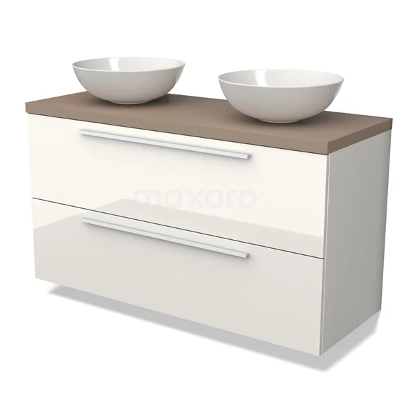 Modulo Plato Badmöbel mit Aufsatzwaschbecken | 120 cm Hochglanz Weiß Flach front Taupe blatt 2 übereinanderliegende Schubladen
