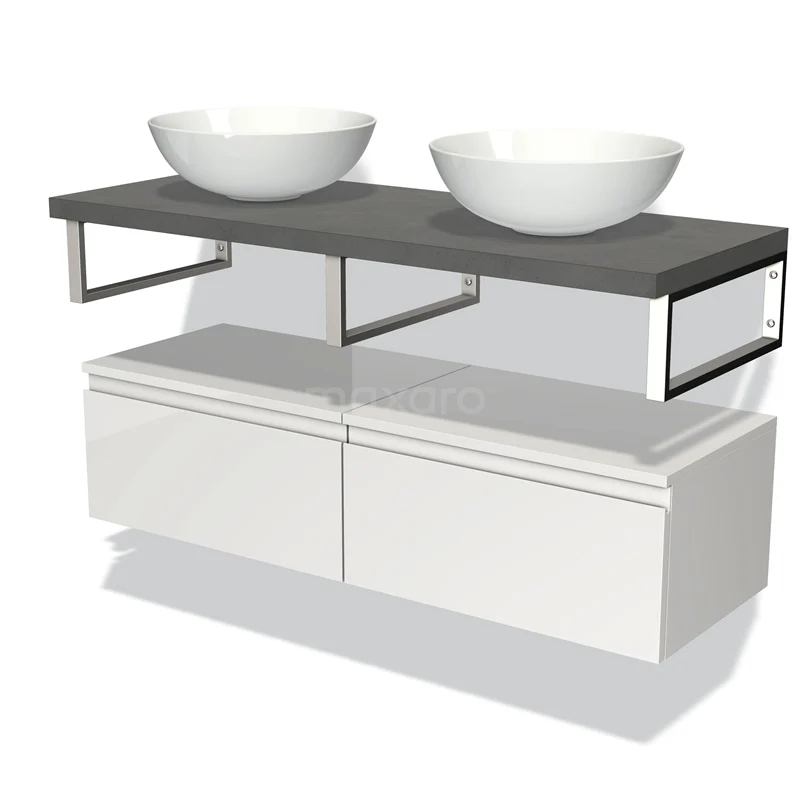 Modulo Plato Badmöbel mit Aufsatzwaschbecken | 120 cm Hochglanz Weiß Grifflos front Dunkelgrauer Beton blatt Tief hängend
