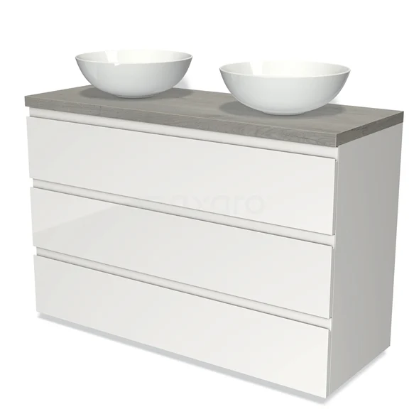 Modulo Plato Badmöbel mit Aufsatzwaschbecken | 120 cm Hochglanz Weiß Grifflos front Graue Eiche blatt 3 Schubladen