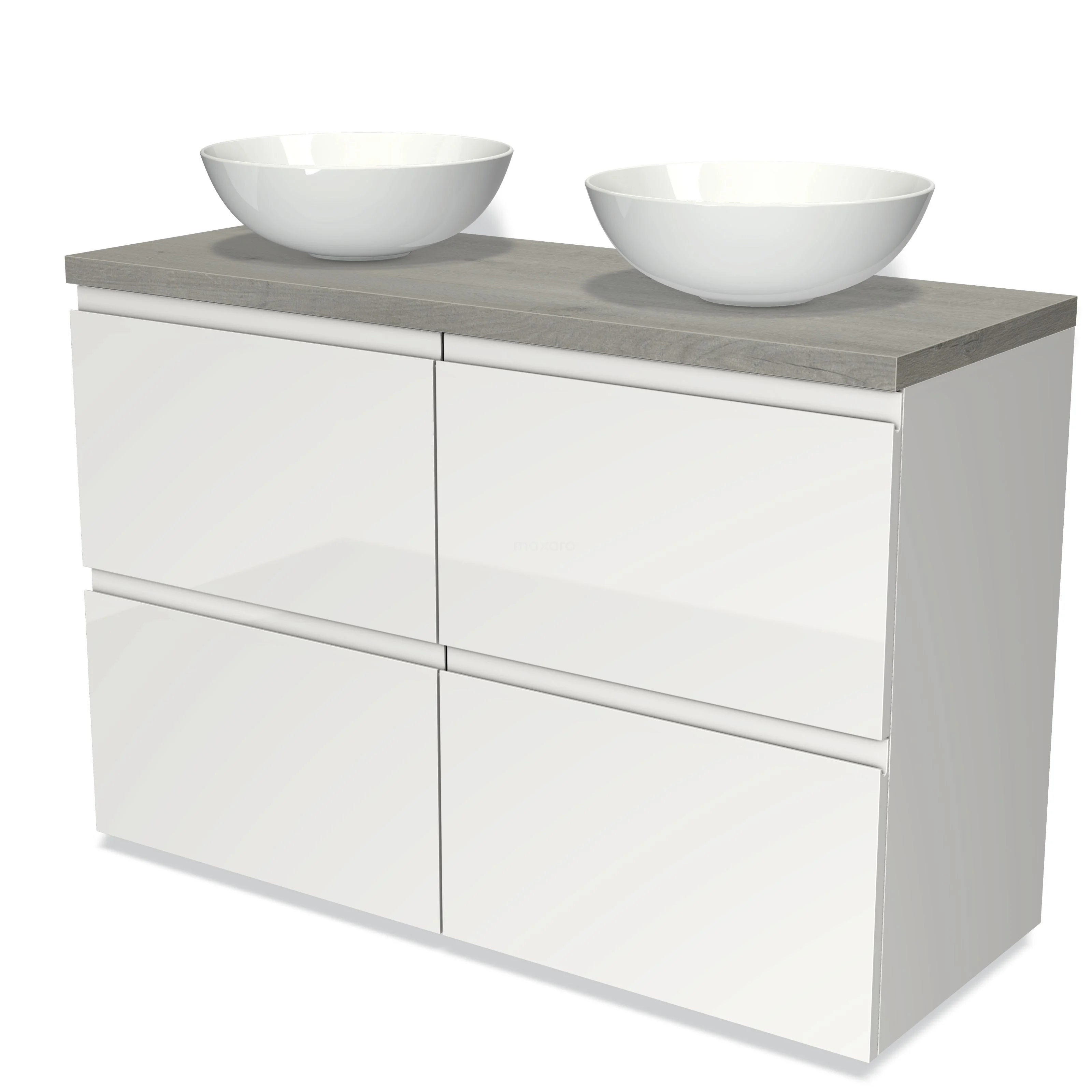 Modulo Plato Badmöbel mit Aufsatzwaschbecken | 120 cm Hochglanz Weiß Grifflos front Graue Eiche blatt 4 hohe Schubladen