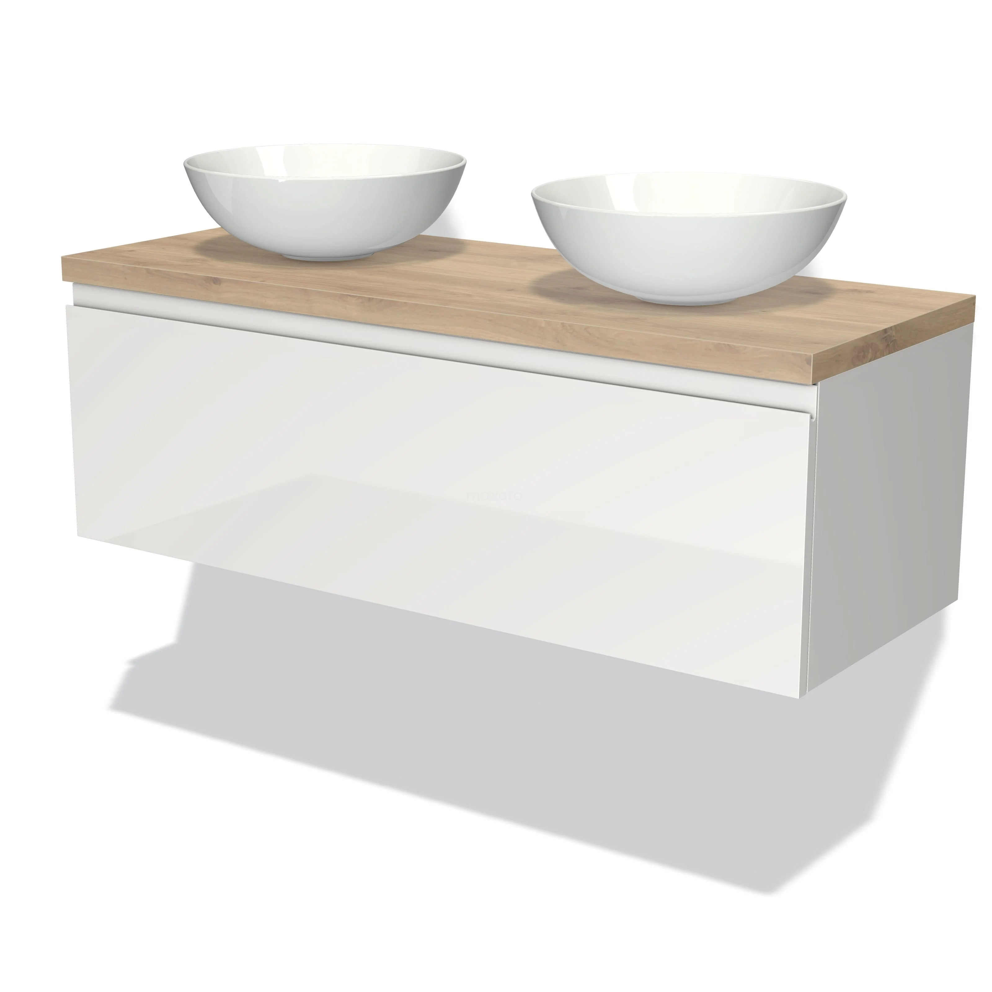 Modulo Plato Badmöbel mit Aufsatzwaschbecken | 120 cm Hochglanz Weiß Grifflos front Hellbraune Eiche blatt 1 Schublade