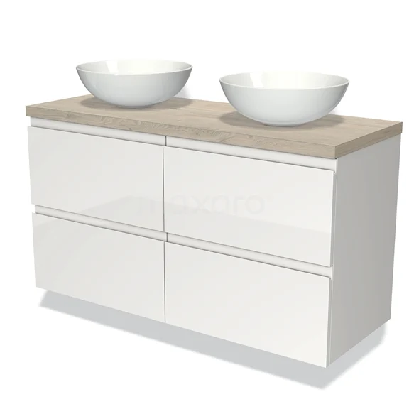 Modulo Plato Badmöbel mit Aufsatzwaschbecken | 120 cm Hochglanz Weiß Grifflos front Hellgraue Eiche blatt 4 Schubladen