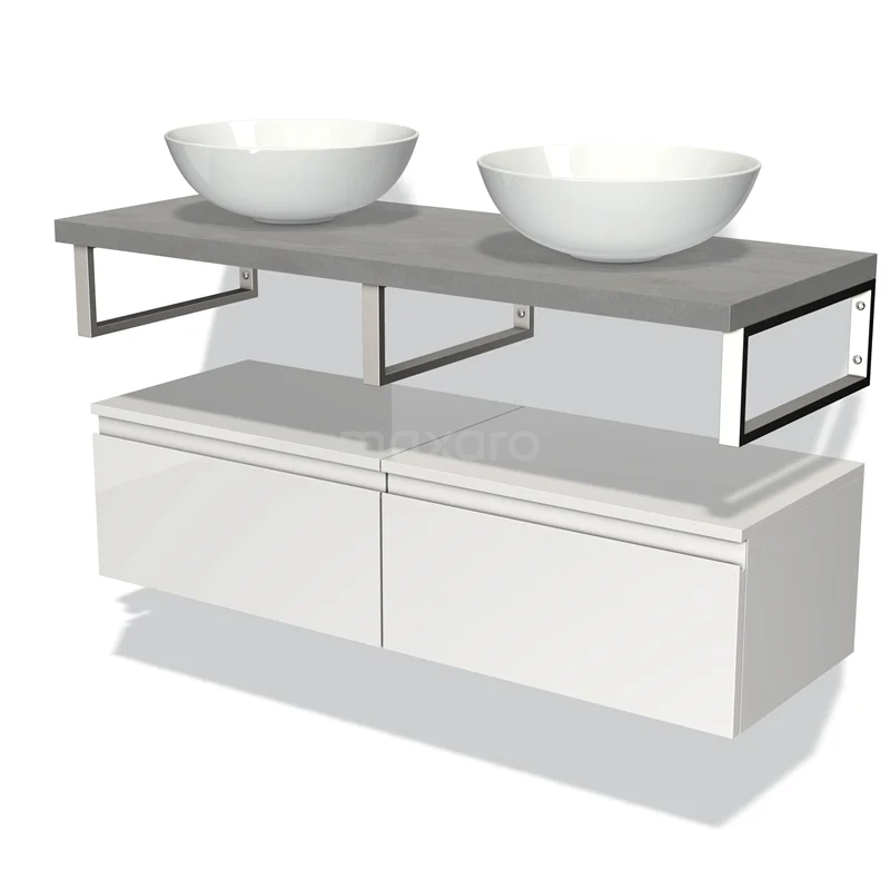 Modulo Plato Badmöbel mit Aufsatzwaschbecken | 120 cm Hochglanz Weiß Grifflos front Hellgrauer Beton blatt Tief hängend