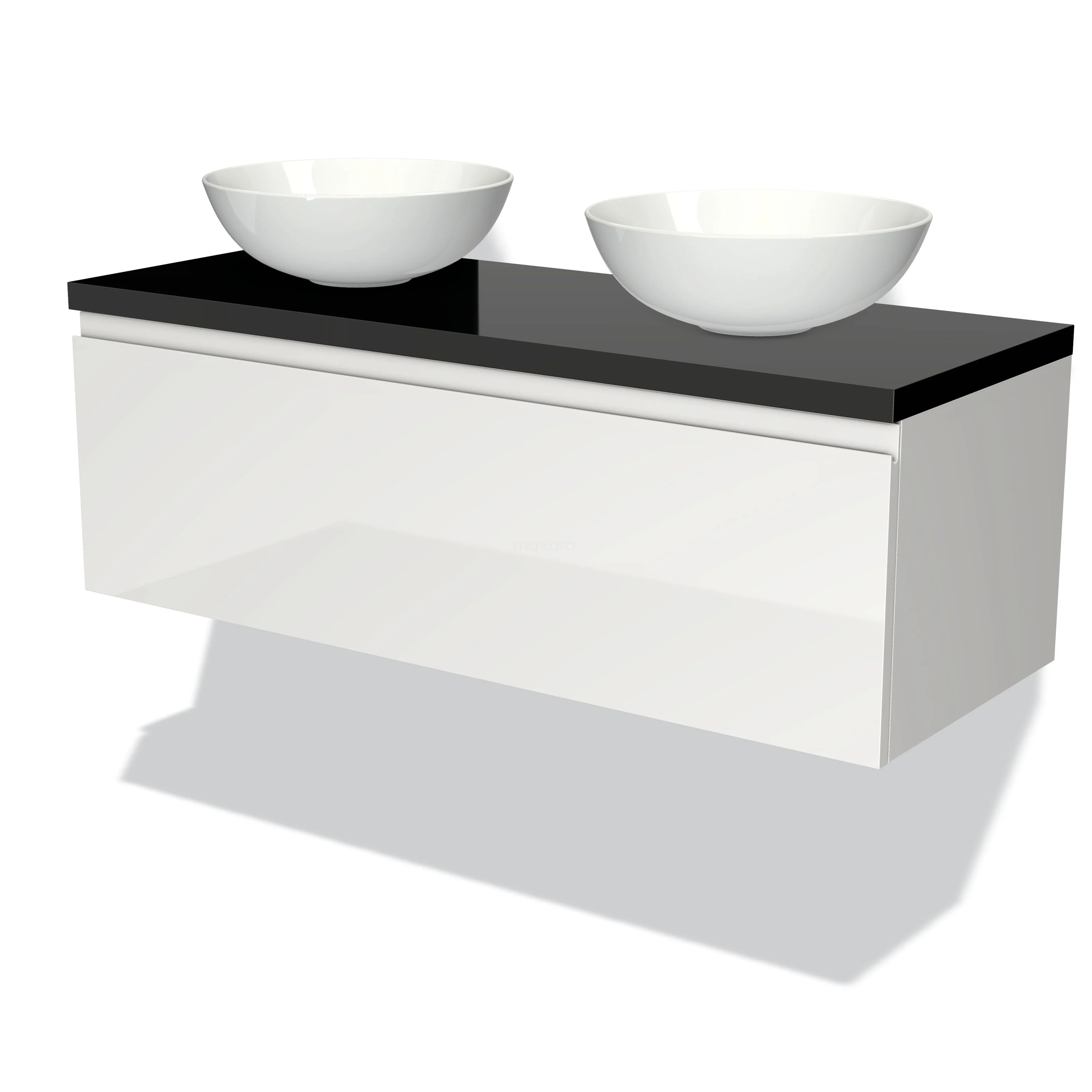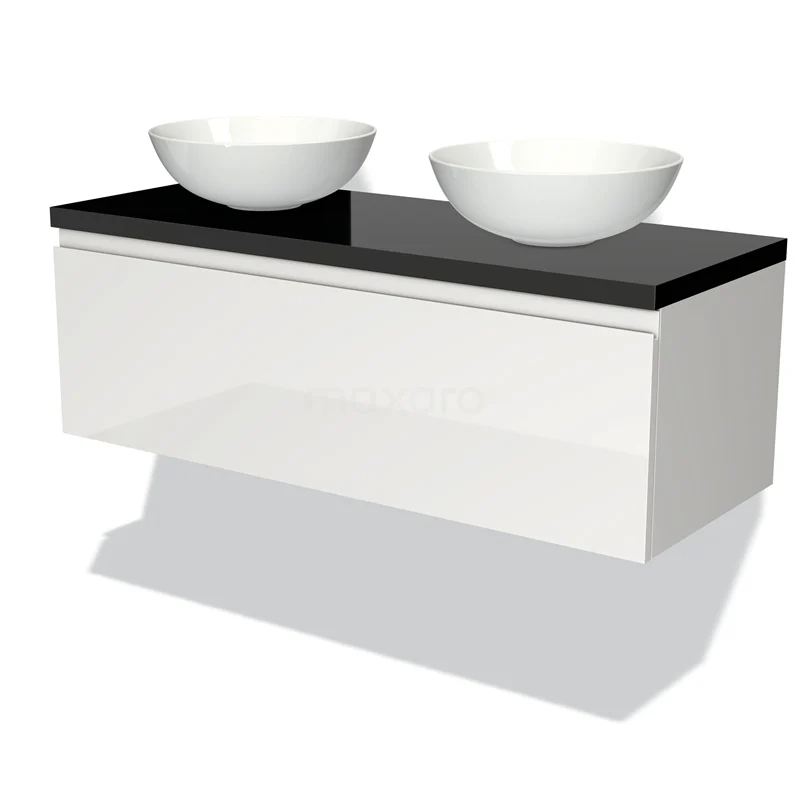 Modulo Plato Badmöbel mit Aufsatzwaschbecken | 120 cm Hochglanz Weiß Grifflos front Hochglanz Schwarz blatt 1 Schublade