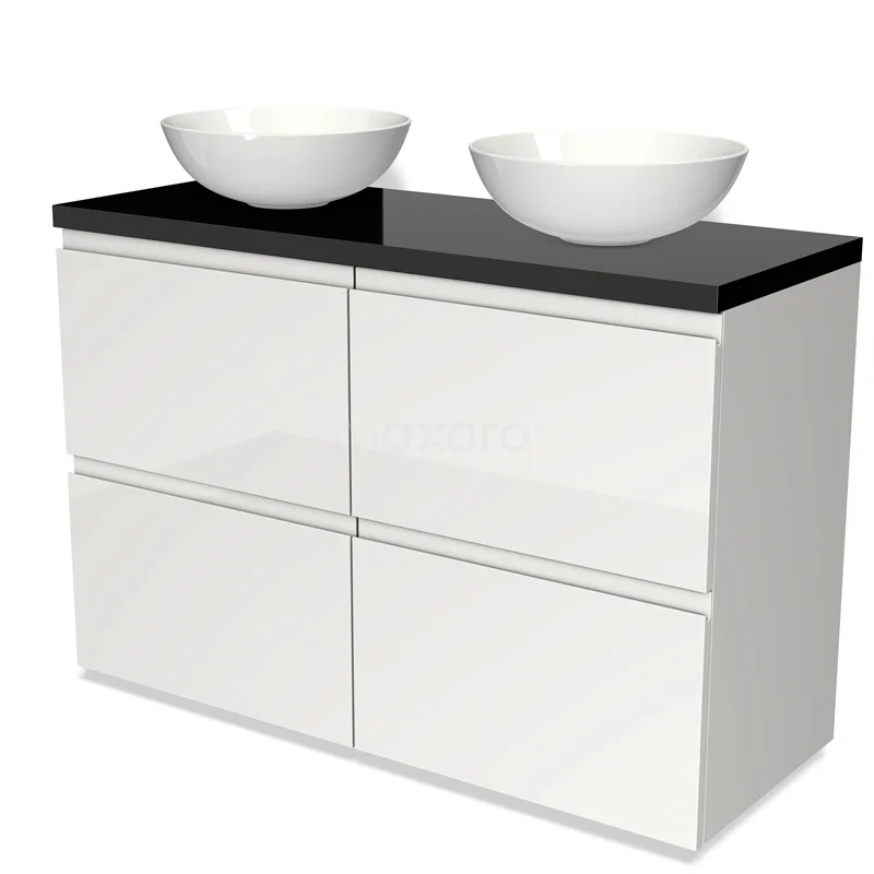 Modulo Plato Badmöbel mit Aufsatzwaschbecken | 120 cm Hochglanz Weiß Grifflos front Hochglanz Schwarz blatt 4 hohe Schubladen