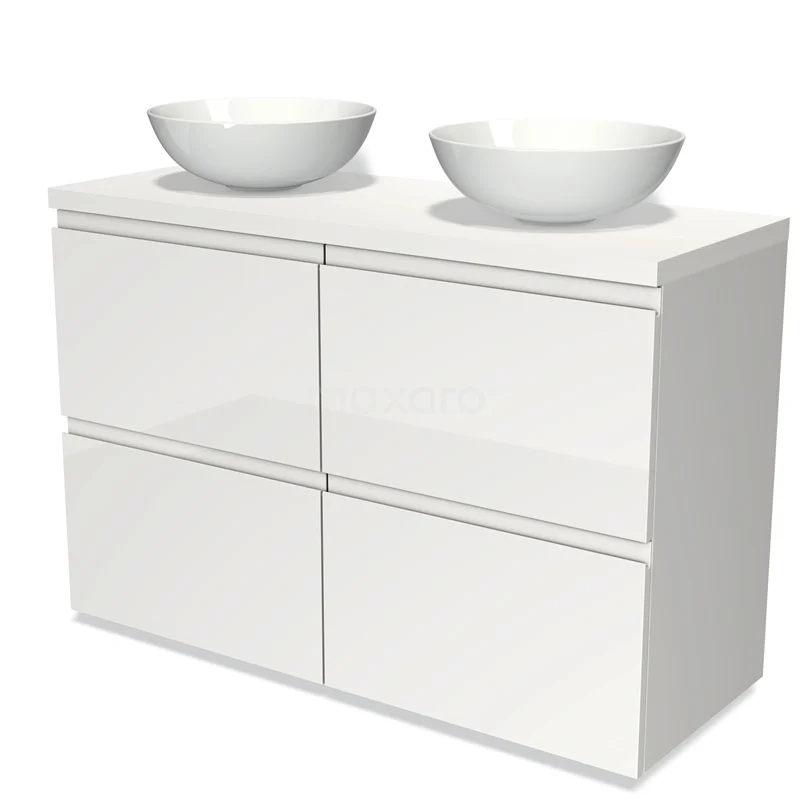 Modulo Plato Badmöbel mit Aufsatzwaschbecken | 120 cm Hochglanz Weiß Grifflos front Matt Weiß blatt 4 hohe Schubladen
