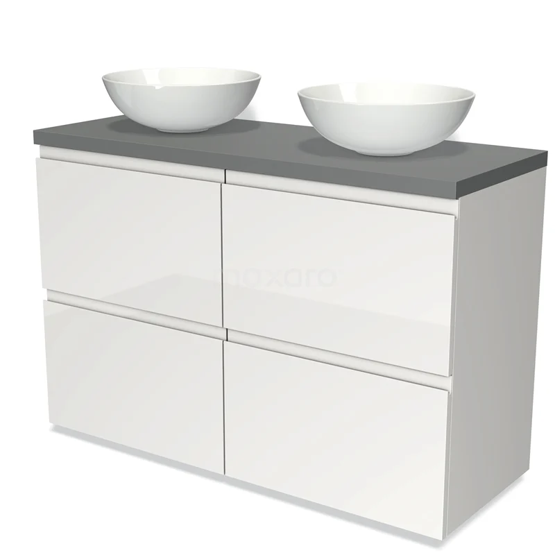 Modulo Plato Badmöbel mit Aufsatzwaschbecken | 120 cm Hochglanz Weiß Grifflos front Mittelgrau blatt 4 hohe Schubladen