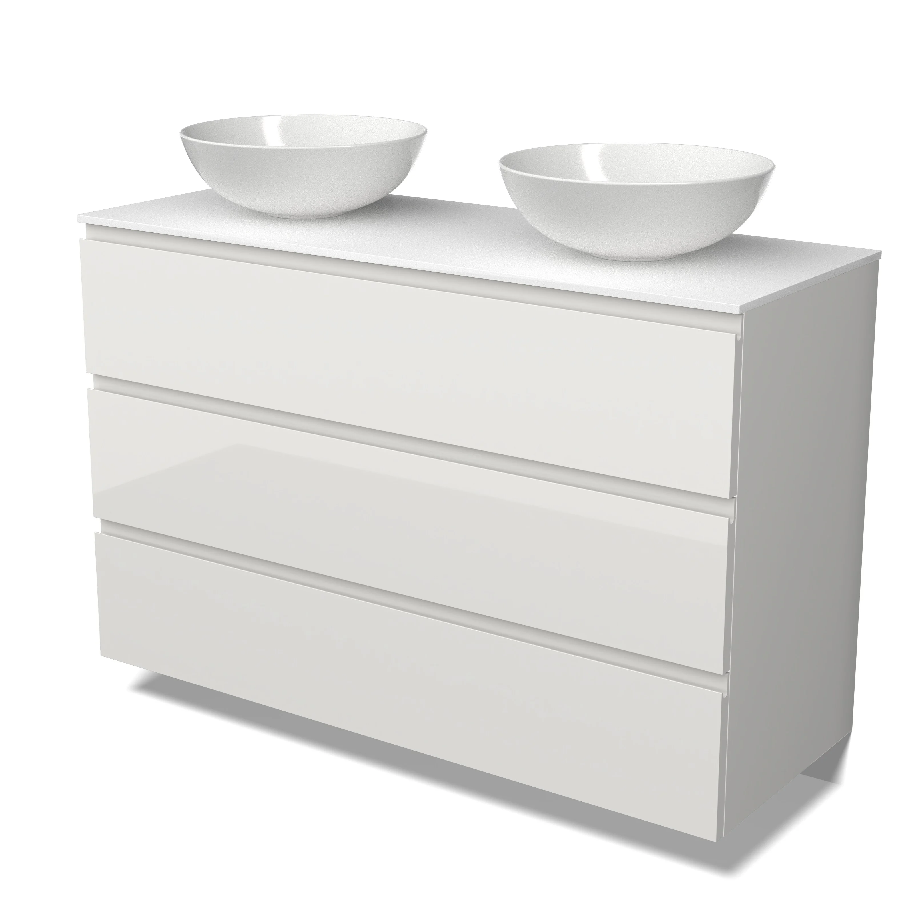 Modulo Plato Badmöbel mit Aufsatzwaschbecken | 120 cm Hochglanz Weiß Grifflos front Solid Surface blatt 3 Schubladen