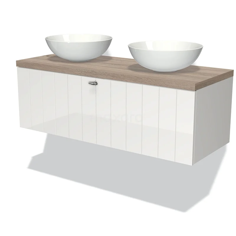 Modulo Plato Badmöbel mit Aufsatzwaschbecken | 120 cm Hochglanz Weiß Lamelle front Eiche blatt 1 Schublade