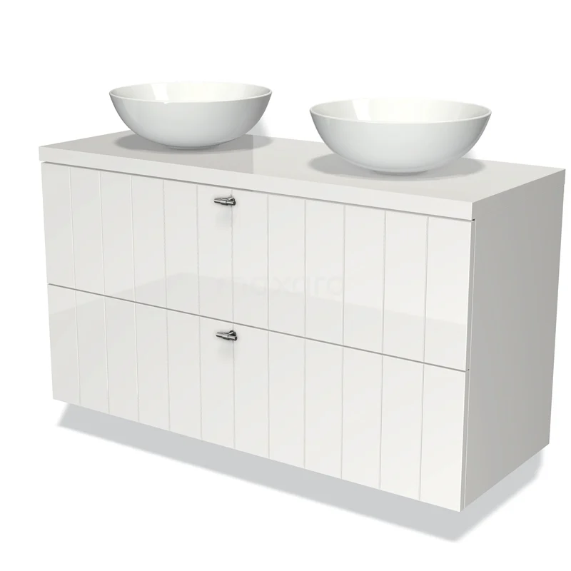 Modulo Plato Badmöbel mit Aufsatzwaschbecken | 120 cm Hochglanz Weiß Lamelle front Hochglanz Weiß blatt 2 übereinanderliegende Schubladen