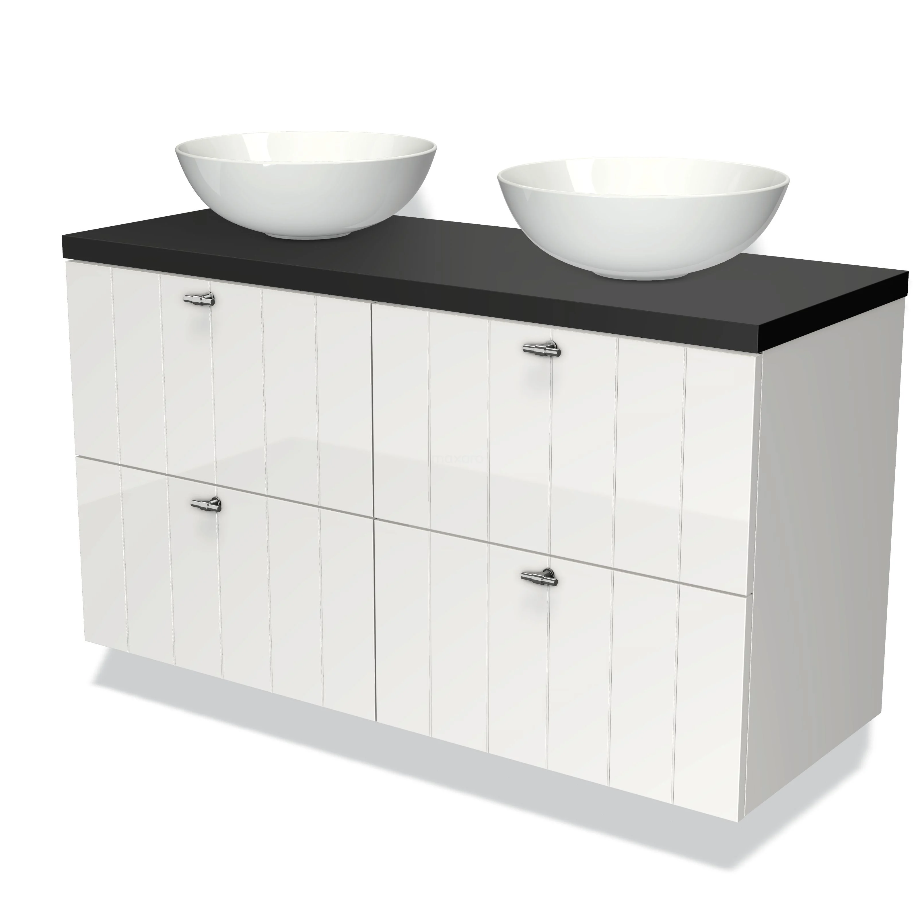 Modulo Plato Badmöbel mit Aufsatzwaschbecken | 120 cm Hochglanz Weiß Lamelle front Matt Schwarz blatt 4 Schubladen