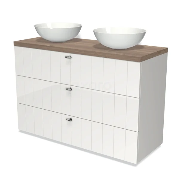 Modulo Plato Badmöbel mit Aufsatzwaschbecken | 120 cm Hochglanz Weiß Lamelle front Mittelbraune Eiche blatt 3 Schubladen