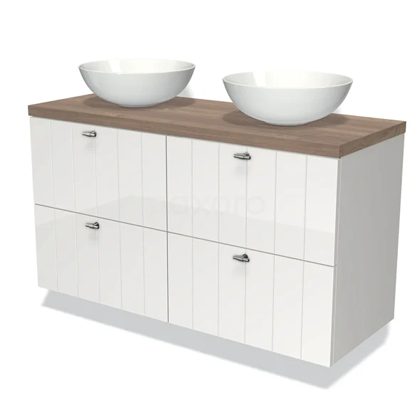 Modulo Plato Badmöbel mit Aufsatzwaschbecken | 120 cm Hochglanz Weiß Lamelle front Mittelbraune Eiche blatt 4 Schubladen
