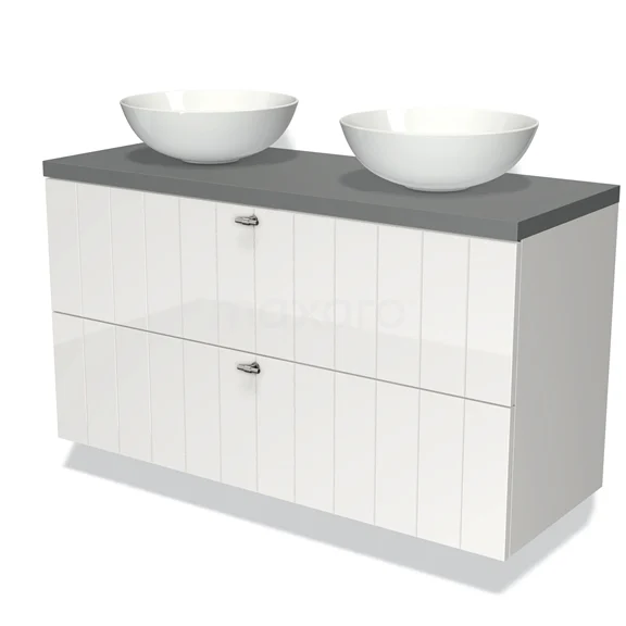 Modulo Plato Badmöbel mit Aufsatzwaschbecken | 120 cm Hochglanz Weiß Lamelle front Mittelgrau blatt 2 übereinanderliegende Schubladen