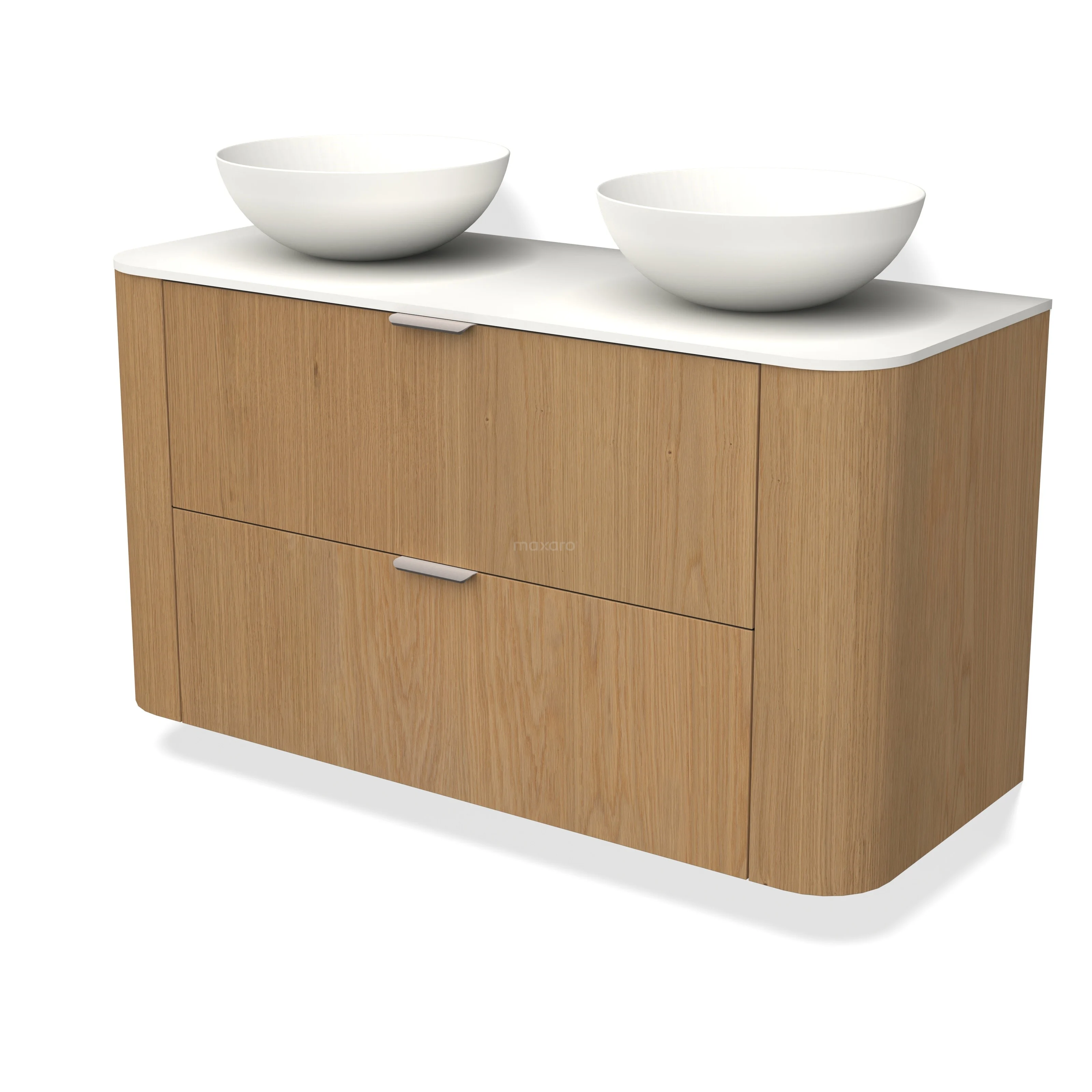 Modulo Plato Badmöbel mit Aufsatzwaschbecken | 120 cm Honigeiche front Solid Surface blatt 2 übereinanderliegende runde Schubladen