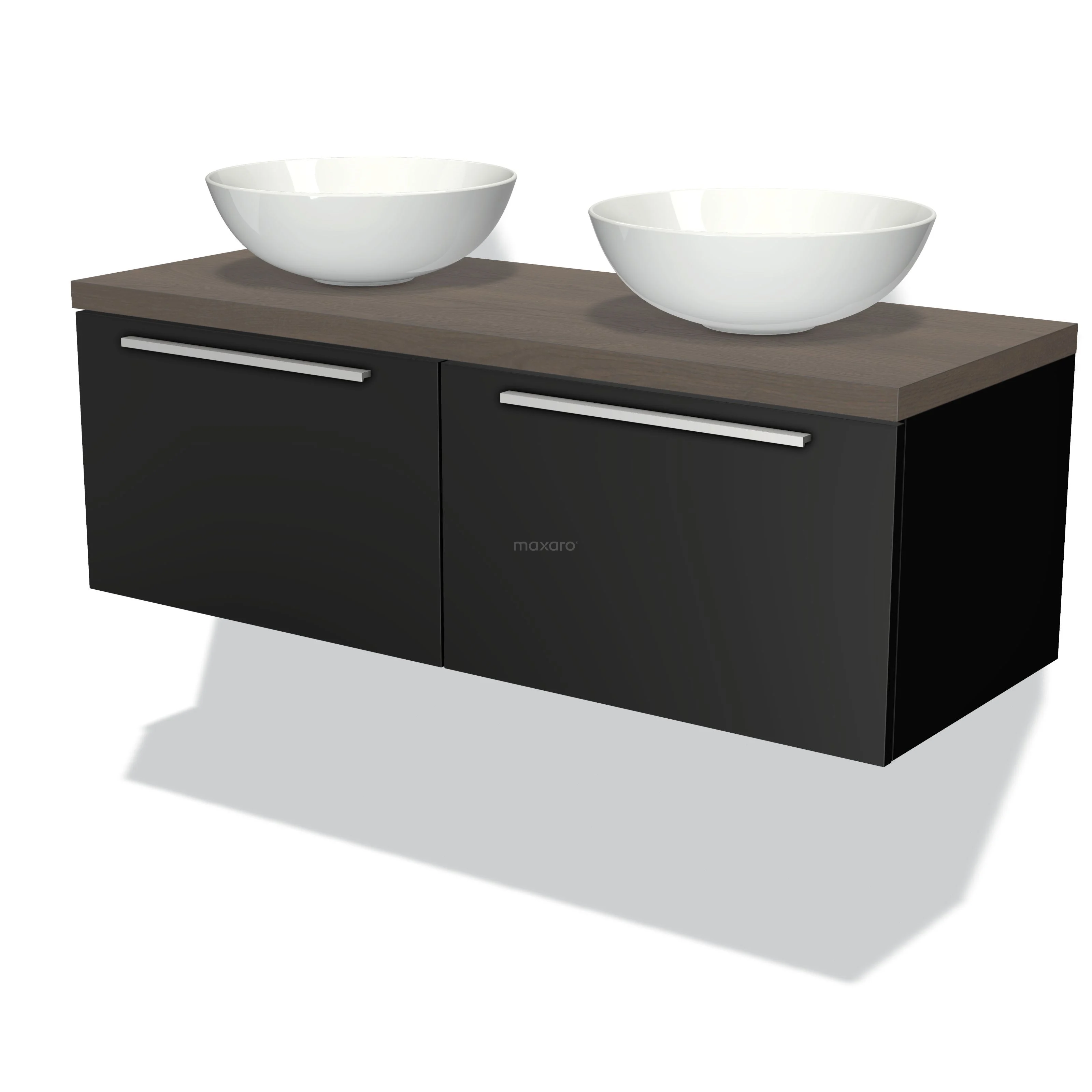 Modulo Plato Badmöbel mit Aufsatzwaschbecken | 120 cm Matt Schwarz Flach front Dunkelbraune Eiche blatt 2 nebeneinanderliegende Schubladen