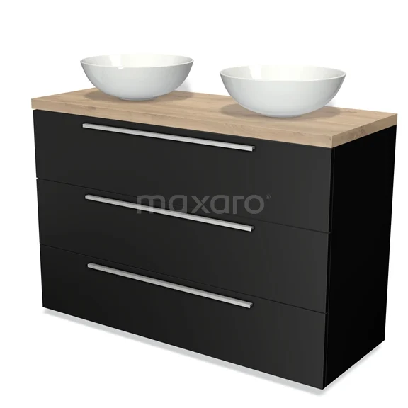 Modulo Plato Badmöbel mit Aufsatzwaschbecken | 120 cm Matt Schwarz Flach front Hellbraune Eiche blatt 3 Schubladen