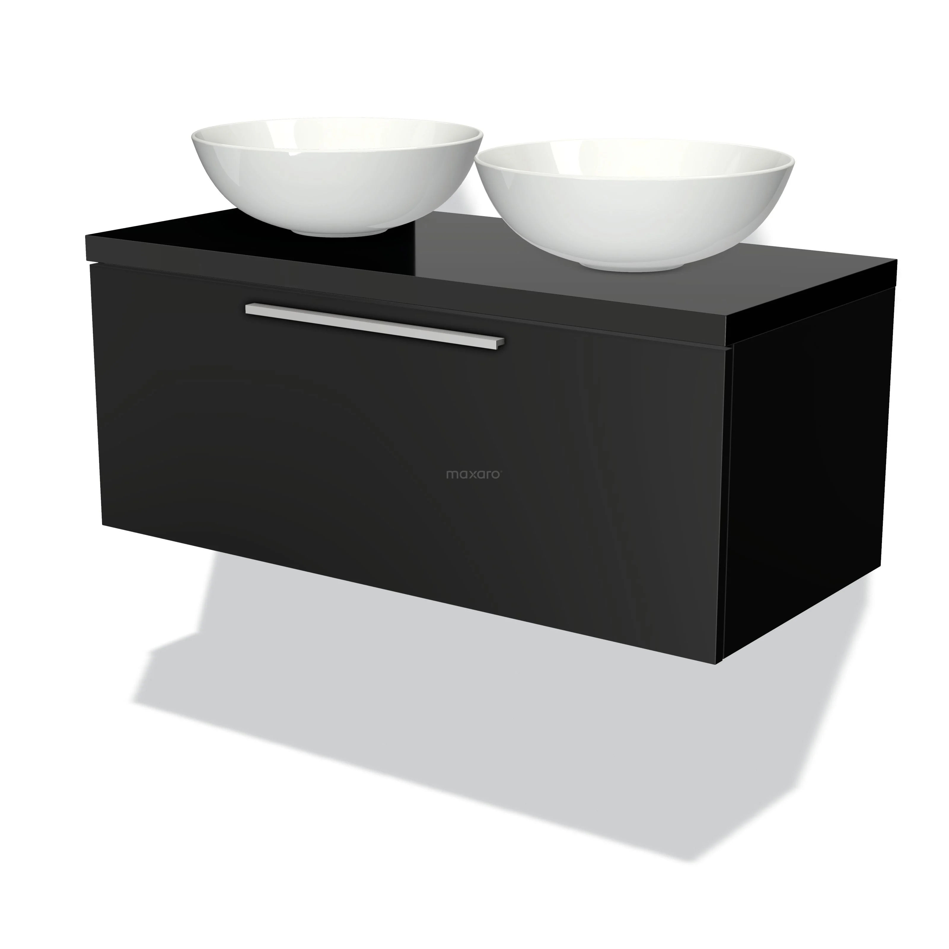 Modulo Plato Badmöbel mit Aufsatzwaschbecken | 120 cm Matt Schwarz Flach front Hochglanz Schwarz blatt 1 Schublade