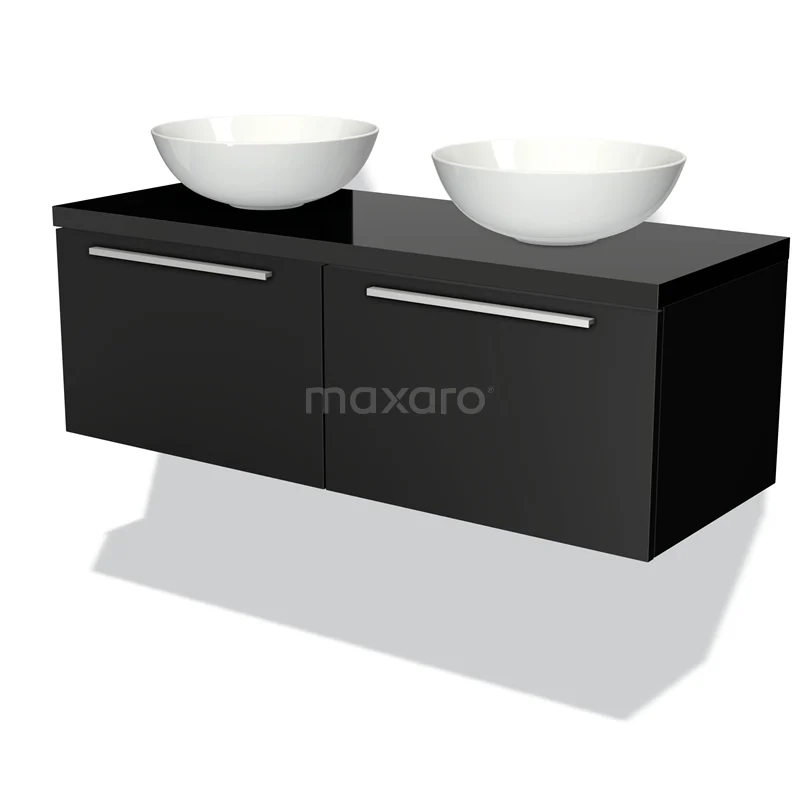 Modulo Plato Badmöbel mit Aufsatzwaschbecken | 120 cm Matt Schwarz Flach front Hochglanz Schwarz blatt 2 nebeneinanderliegende Schubladen