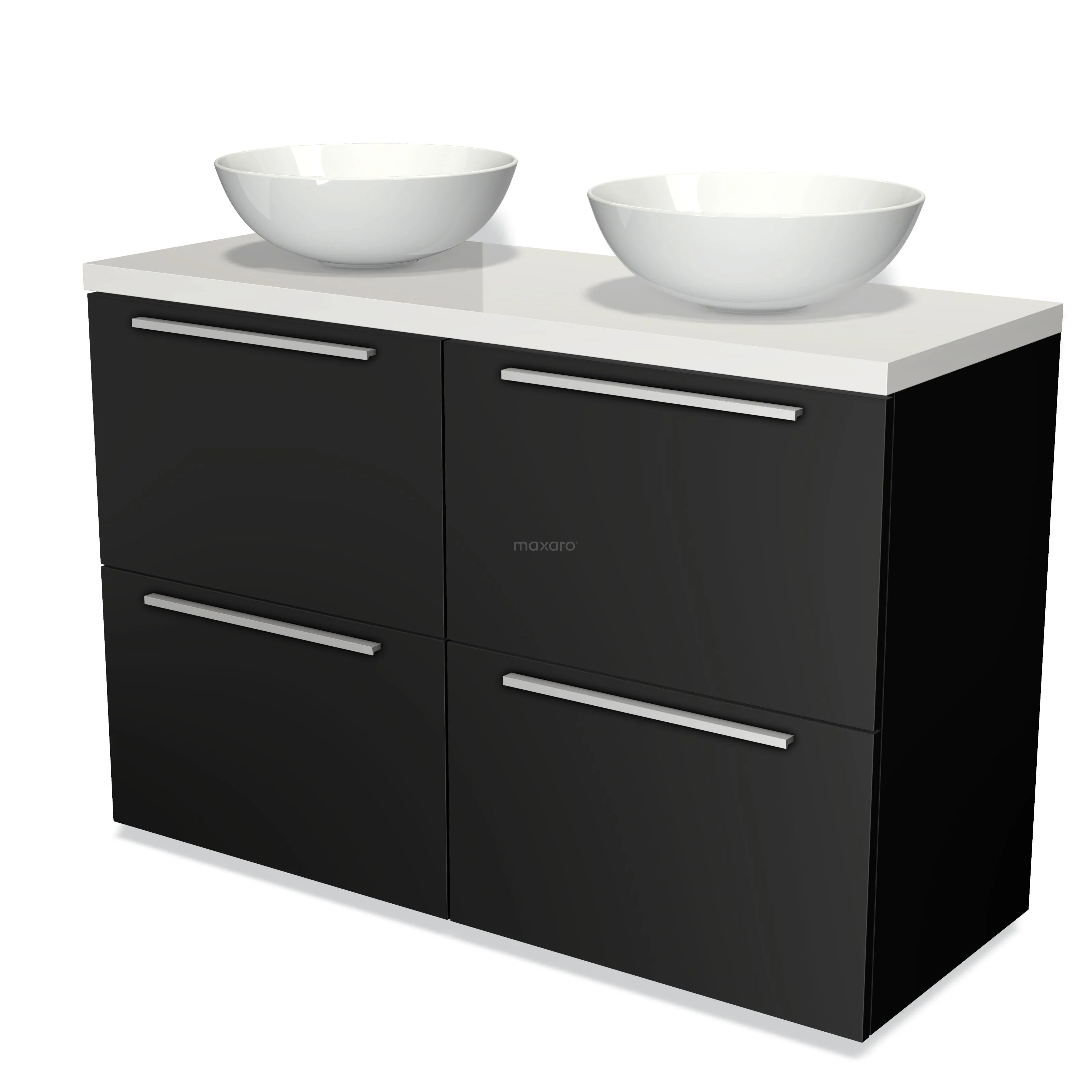 Modulo Plato Badmöbel mit Aufsatzwaschbecken | 120 cm Matt Schwarz Flach front Hochglanz Weiß blatt 4 hohe Schubladen