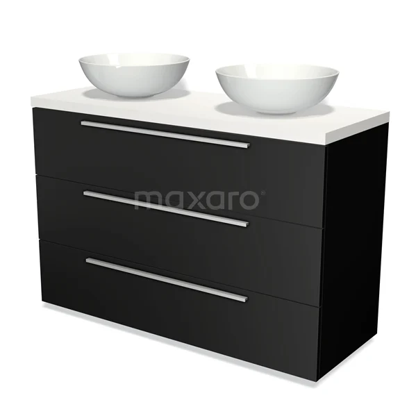 Modulo Plato Badmöbel mit Aufsatzwaschbecken | 120 cm Matt Schwarz Flach front Matt Weiß blatt 3 Schubladen
