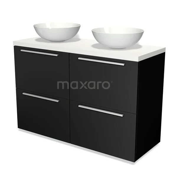 Modulo Plato Badmöbel mit Aufsatzwaschbecken | 120 cm Matt Schwarz Flach front Matt Weiß blatt 4 hohe Schubladen