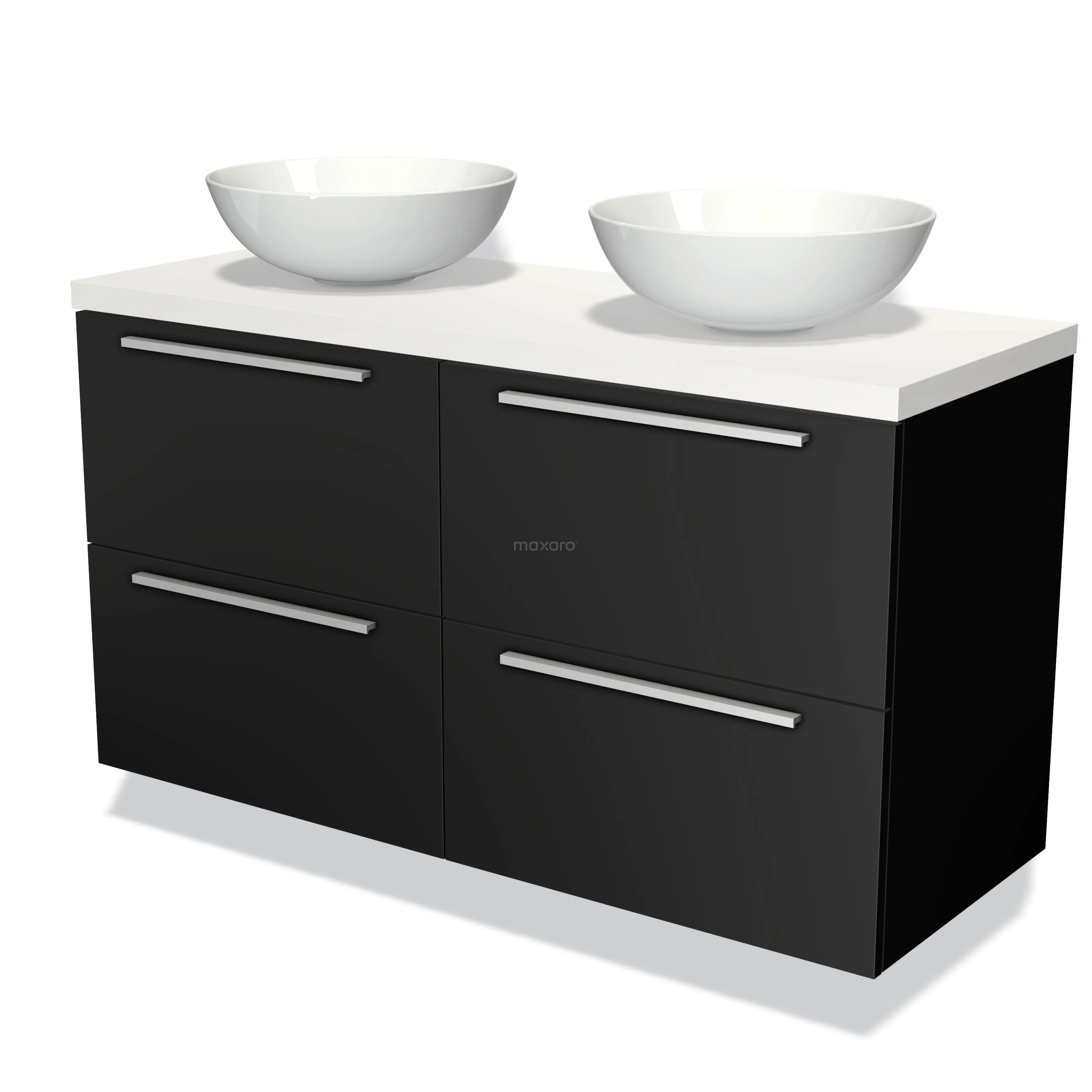 Modulo Plato Badmöbel mit Aufsatzwaschbecken | 120 cm Matt Schwarz Flach front Matt Weiß blatt 4 Schubladen