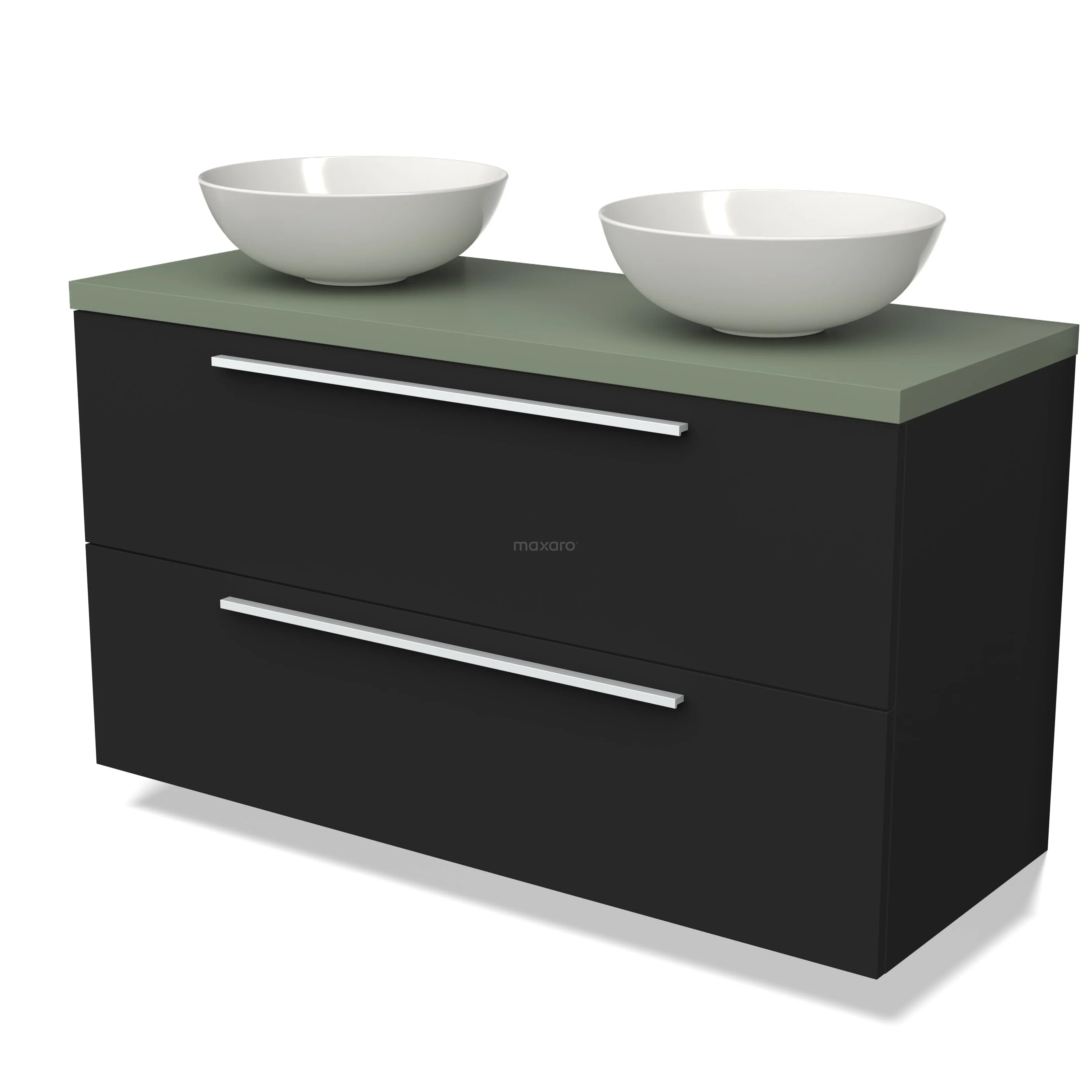 Modulo Plato Badmöbel mit Aufsatzwaschbecken | 120 cm Matt Schwarz Flach front Salbeigrün blatt 2 übereinanderliegende Schubladen