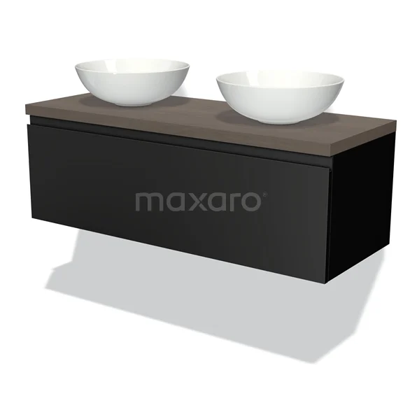Modulo Plato Badmöbel mit Aufsatzwaschbecken | 120 cm Matt Schwarz Grifflos front Dunkelbraune Eiche blatt 1 Schublade