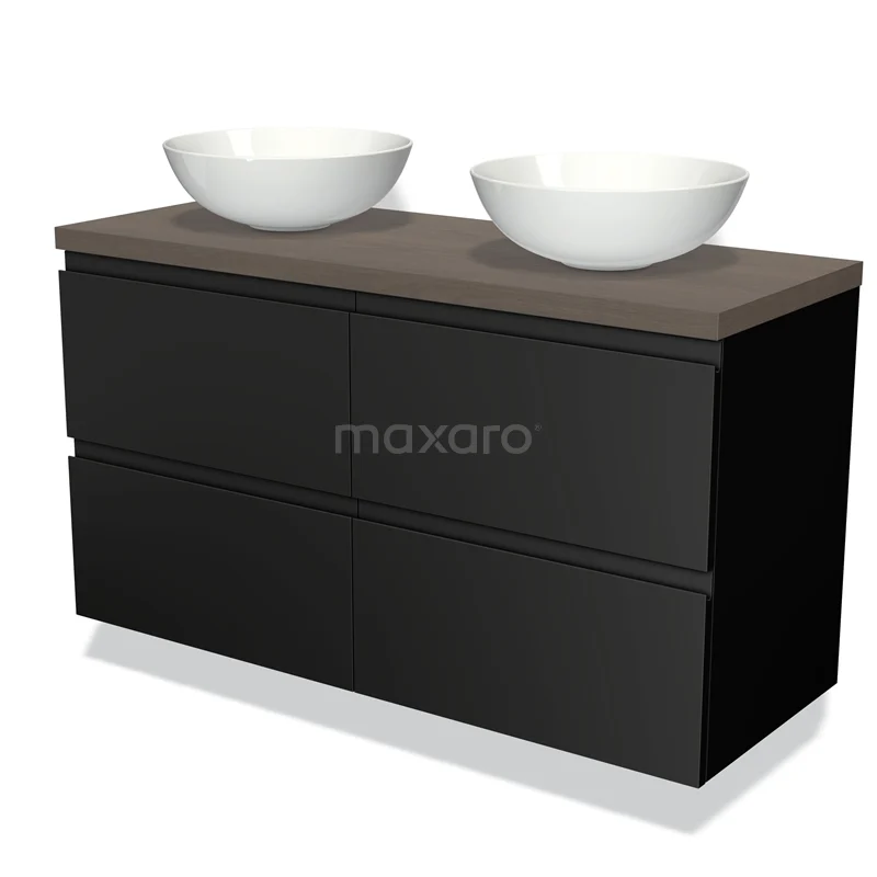 Modulo Plato Badmöbel mit Aufsatzwaschbecken | 120 cm Matt Schwarz Grifflos front Dunkelbraune Eiche blatt 4 Schubladen