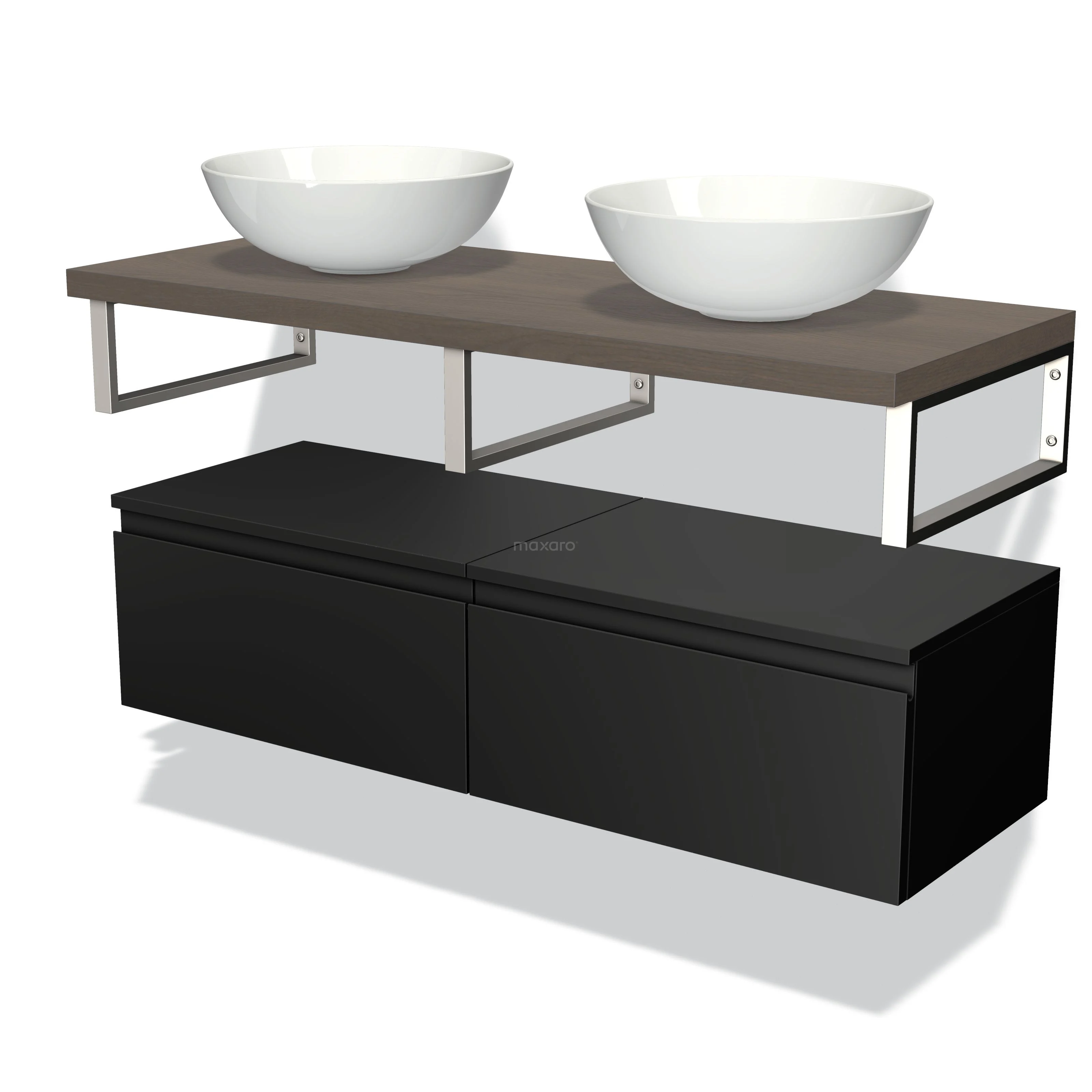 Modulo Plato Badmöbel mit Aufsatzwaschbecken | 120 cm Matt Schwarz Grifflos front Dunkelbraune Eiche blatt Tief hängend
