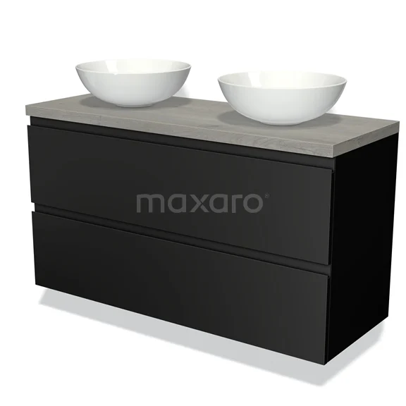 Modulo Plato Badmöbel mit Aufsatzwaschbecken | 120 cm Matt Schwarz Grifflos front Graue Eiche blatt 2 übereinanderliegende Schubladen