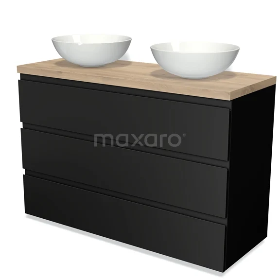 Modulo Plato Badmöbel mit Aufsatzwaschbecken | 120 cm Matt Schwarz Grifflos front Hellbraune Eiche blatt 3 Schubladen