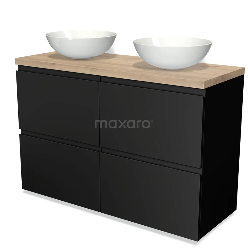 Modulo Plato Badmöbel mit Aufsatzwaschbecken | 120 cm Matt Schwarz Grifflos front Hellbraune Eiche blatt 4 hohe Schubladen