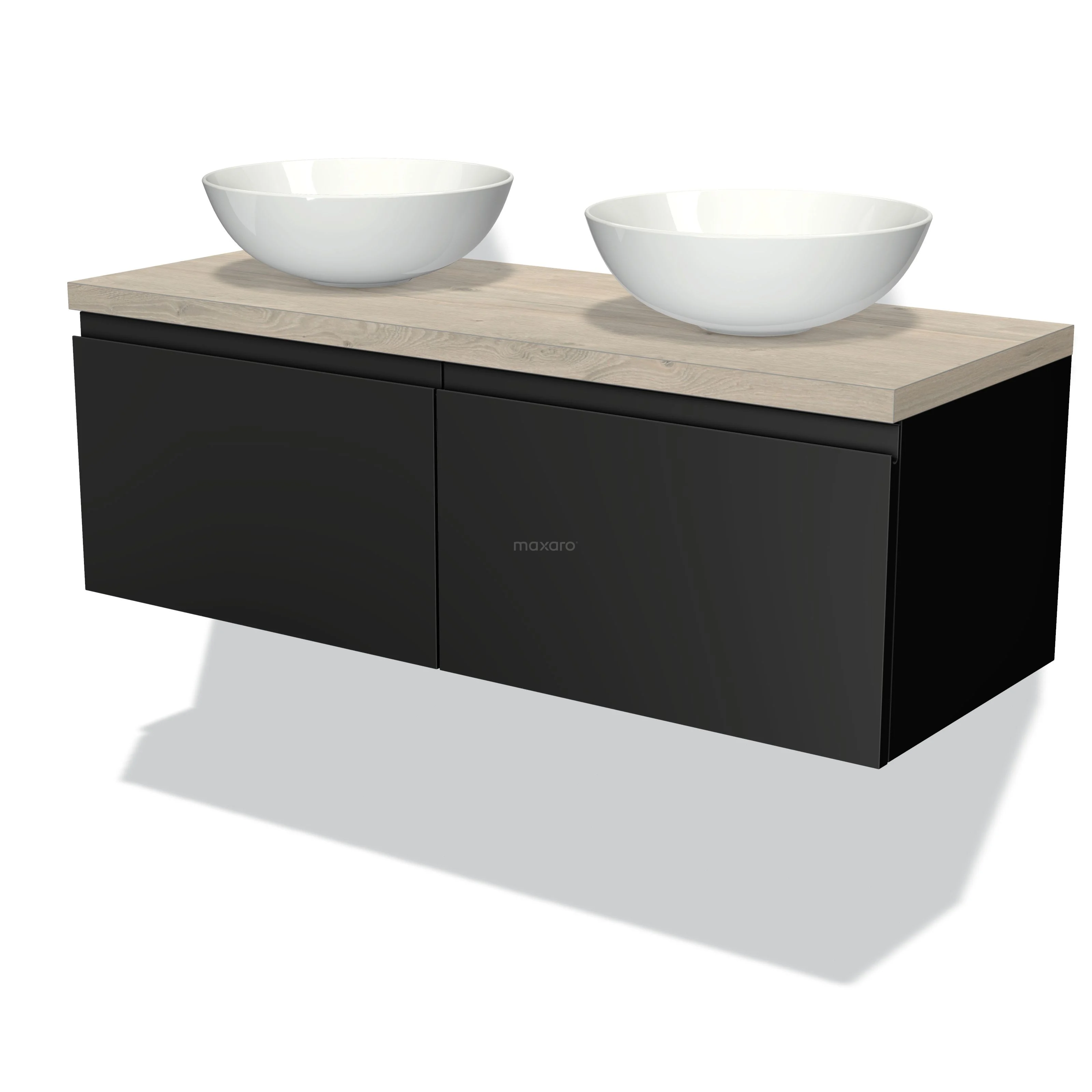 Modulo Plato Badmöbel mit Aufsatzwaschbecken | 120 cm Matt Schwarz Grifflos front Hellgraue Eiche blatt 2 nebeneinanderliegende Schubladen