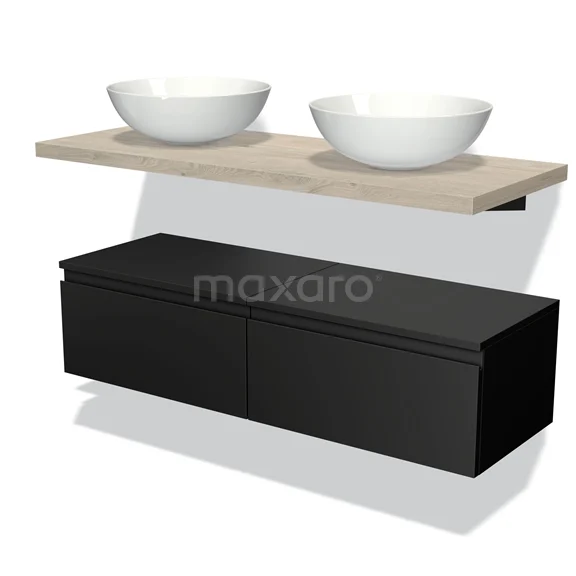 Modulo Plato Badmöbel mit Aufsatzwaschbecken | 120 cm Matt Schwarz Grifflos front Hellgraue Eiche blatt Tief hängend