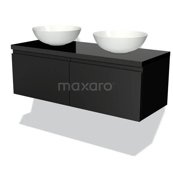 Modulo Plato Badmöbel mit Aufsatzwaschbecken | 120 cm Matt Schwarz Grifflos front Hochglanz Schwarz blatt 2 nebeneinanderliegende Schubladen