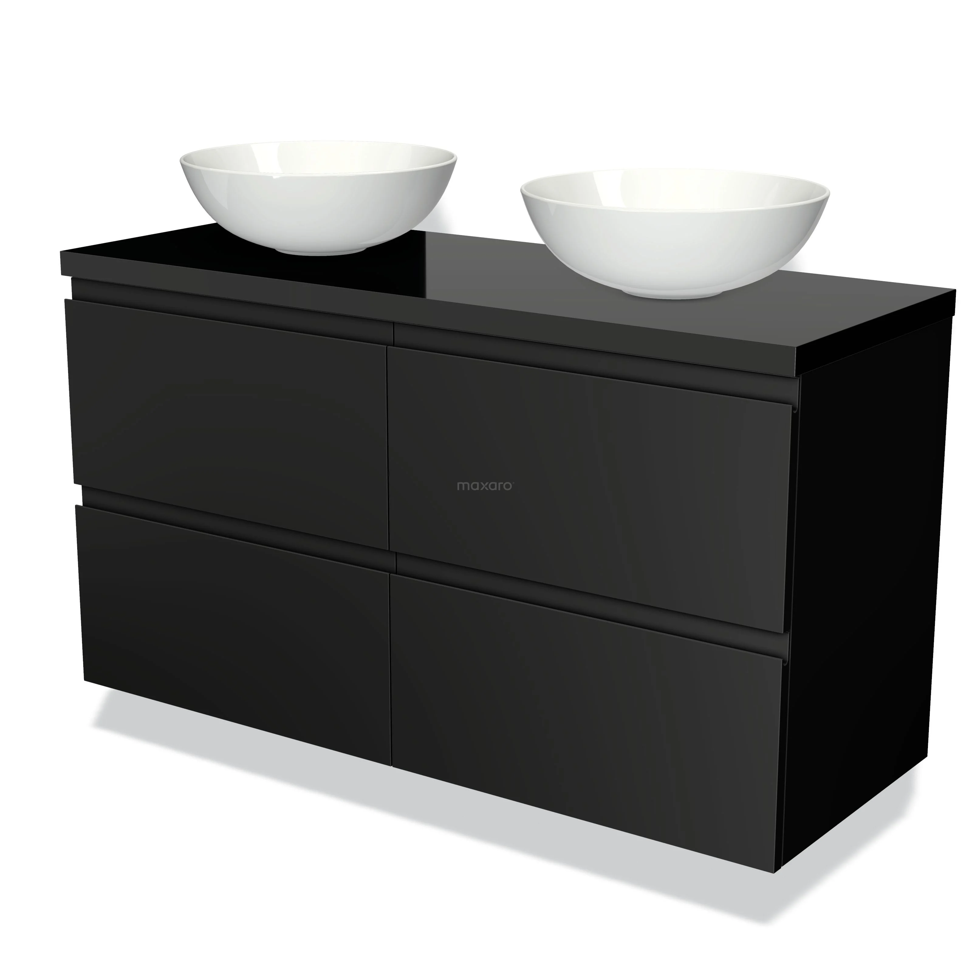 Modulo Plato Badmöbel mit Aufsatzwaschbecken | 120 cm Matt Schwarz Grifflos front Hochglanz Schwarz blatt 4 Schubladen